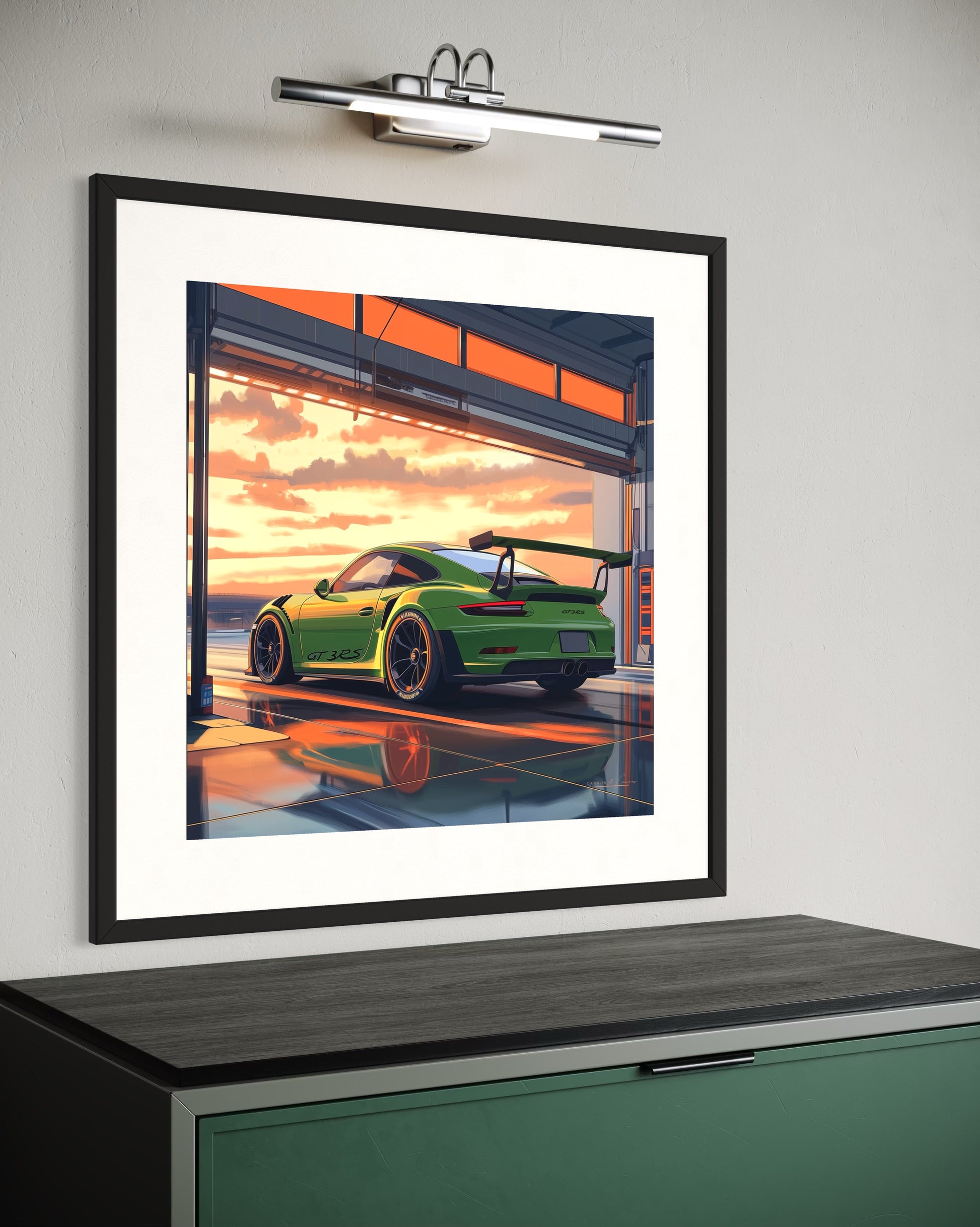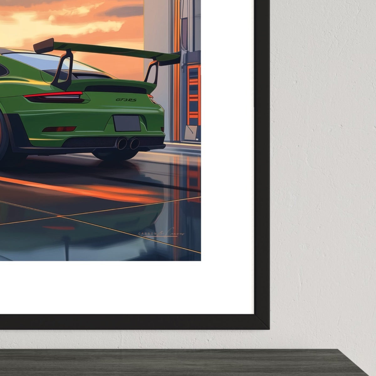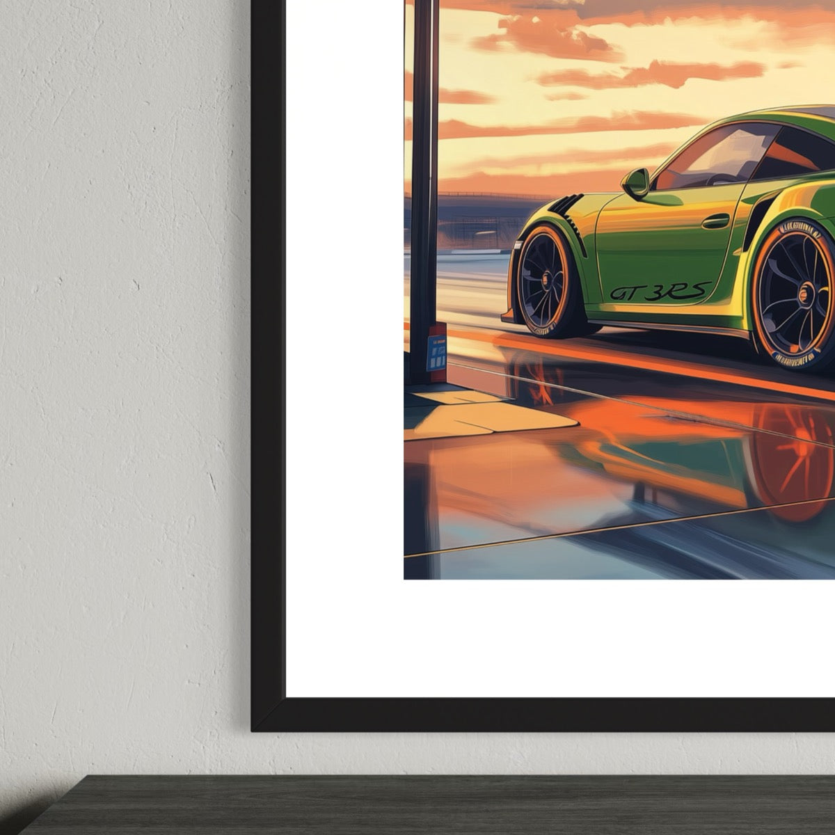 Rolling out into that sunset, 500 horsepower under foot with a manual transmission, a dream run is on the cards. This bright automotive art piece is made on high quality thick paper with a part gloss, part matte finish for sharp finish. Add this fine piece to your office or den, sure to add cool character to that space.