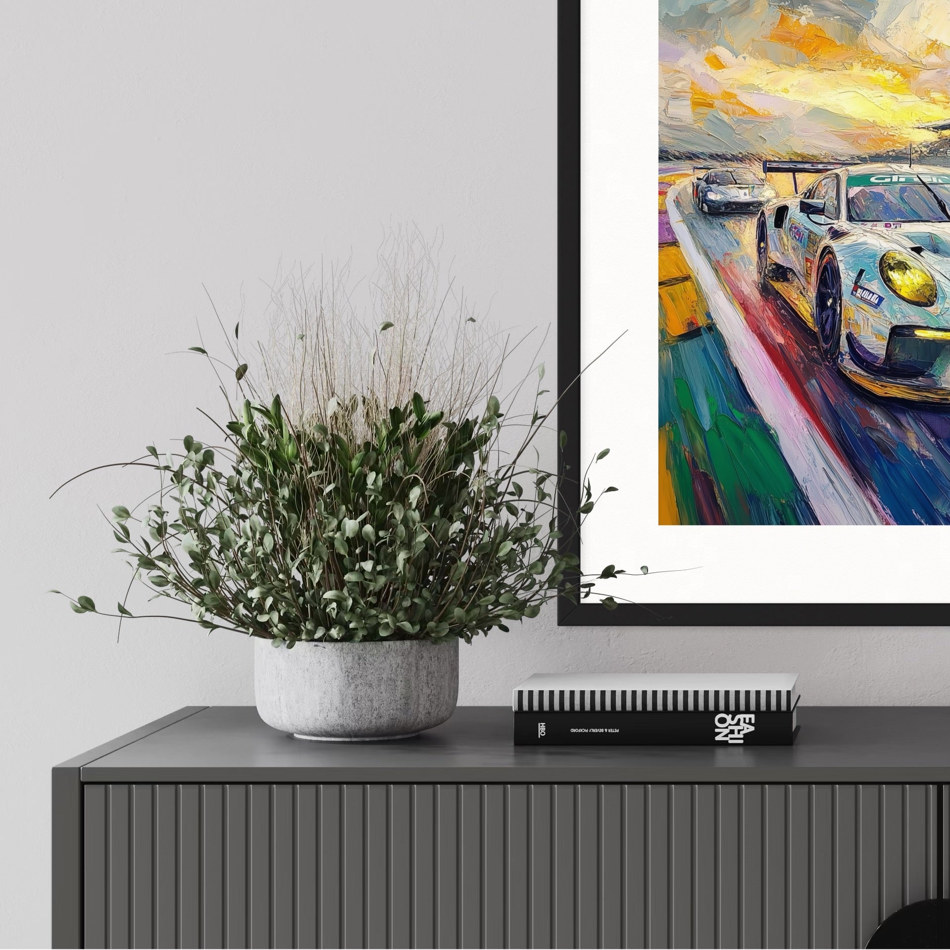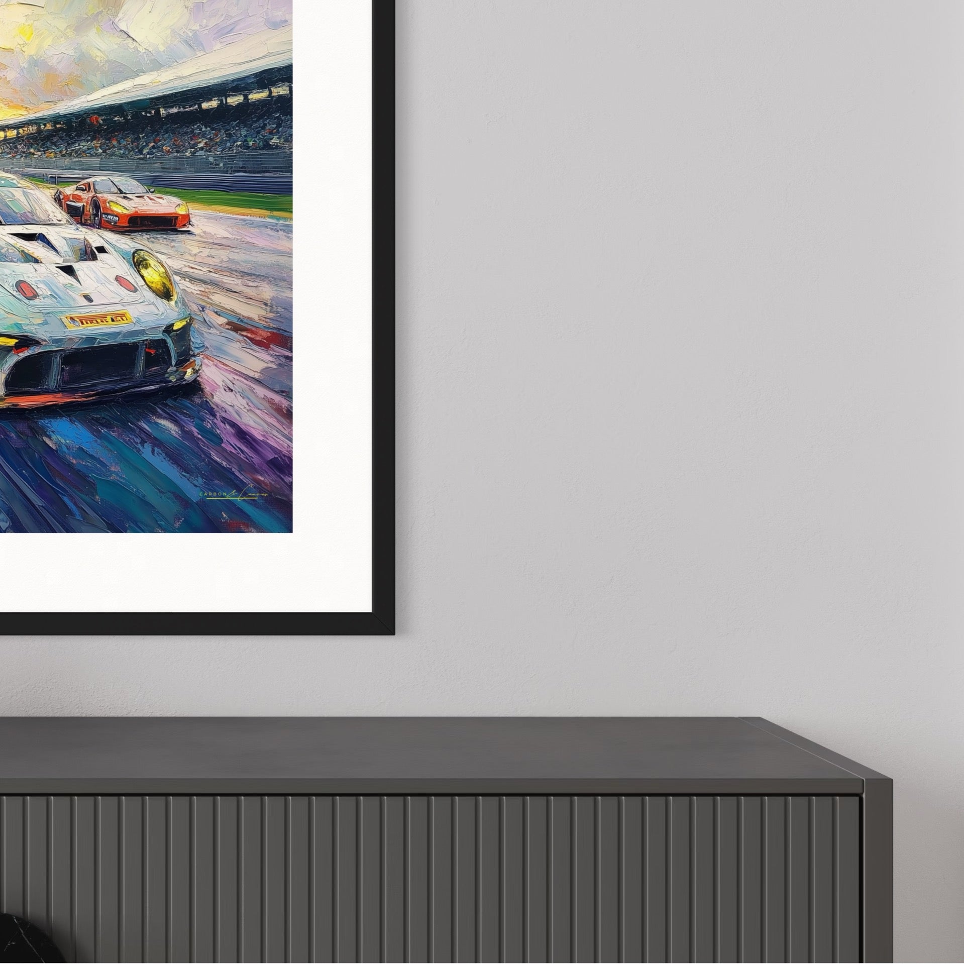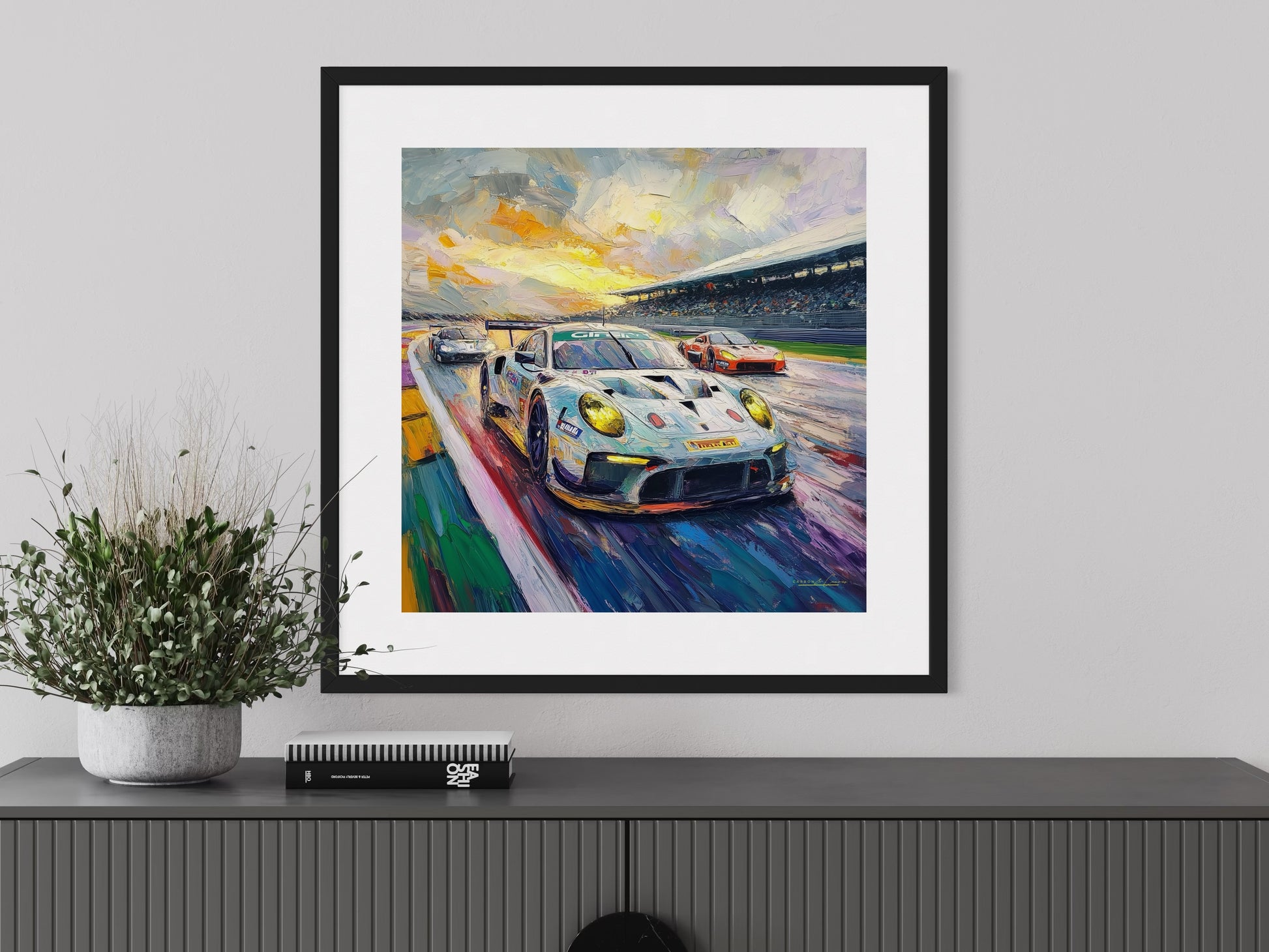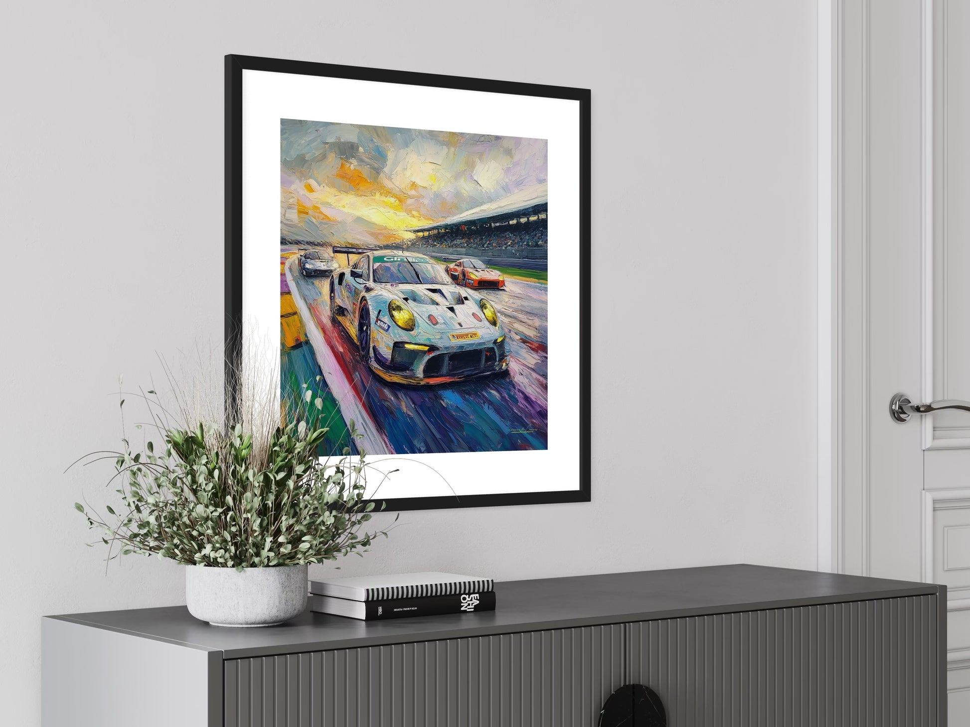 Wave to the crowd with this on track impression, this GT3 art piece is printed on thick high grade paper with part gloss, part matte finish for depth and sharp result. Add this bold art piece to your room or office to create an eye catching space.